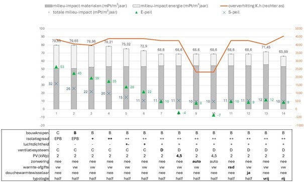 In de onderstaande afbeelding worden alle resultaten weergegeven. De milieu-impact wordt afgebeeld in de grijze balken: donkergrijs voor de impact ten gevolge van de materialen, lichtgrijs voor de impact van het energieverbruik. De groene driehoekjes tonen het E-peil (energieprestatie), de blauwe kruisjes tonen het S-peil (isolatiegraad). De oranje lijn toont op de rechteras het risico op oververhitting. Onder de figuur toont een tabel de inputparameters van de 14 scenario’s.