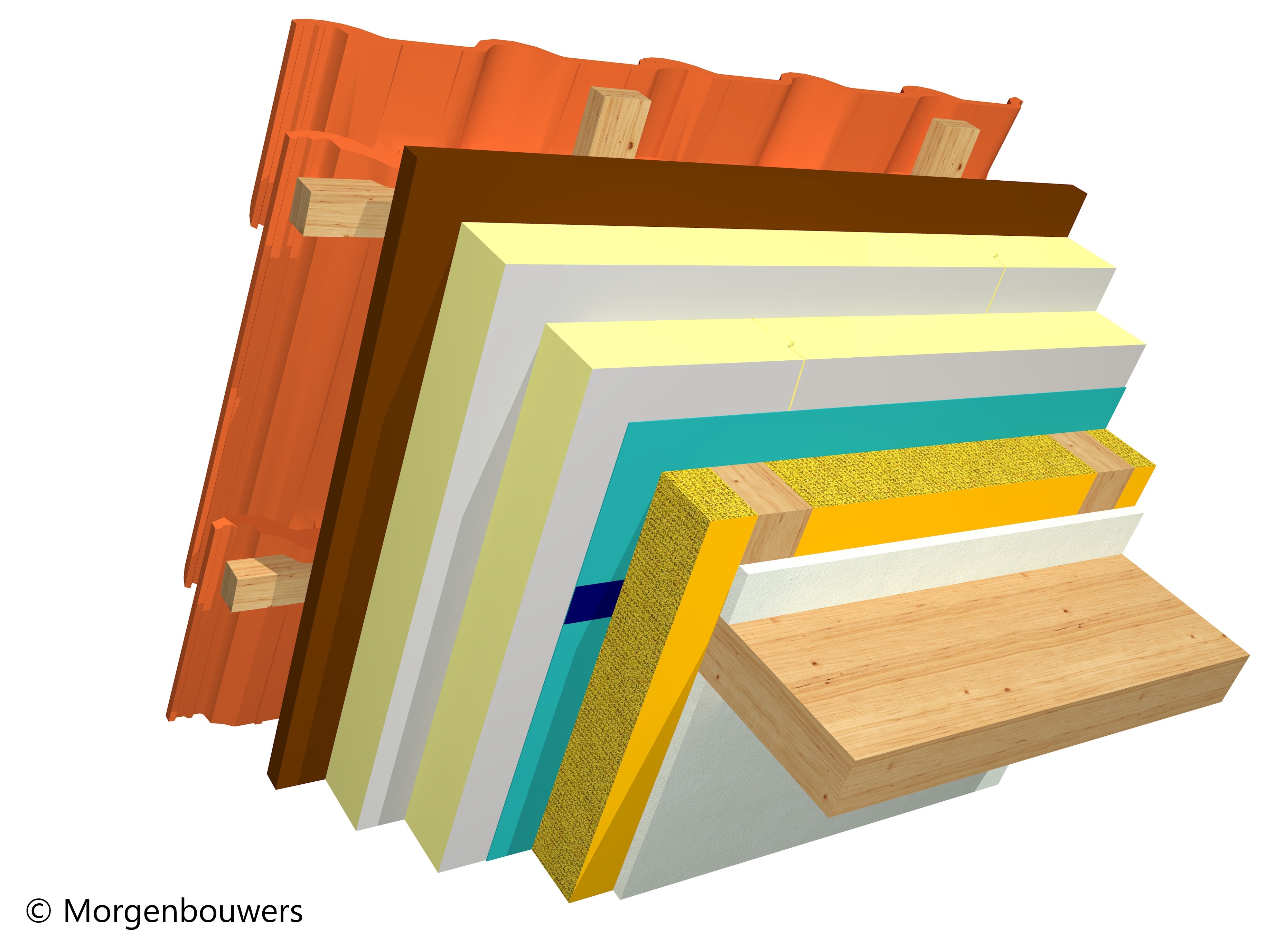 gording â binnenafwerking â soepele isolatie tussen kepers â luchtdicht dampscherm â vormvaste isolatieplaten in twee lagen â dampopen onderdak â tengellatten â panlatten â dakbedekking